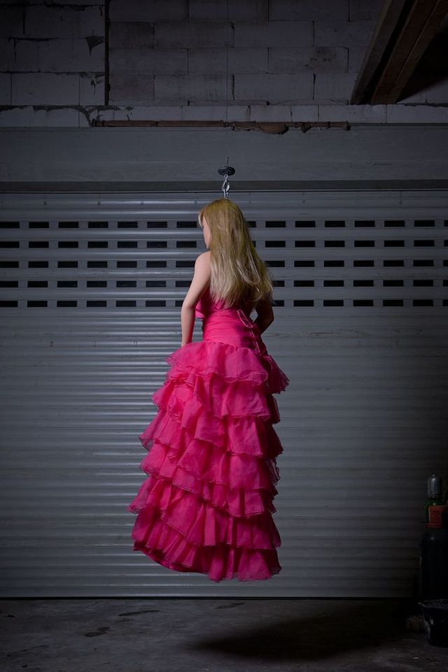 Auf einem Bild sieht man eine Puppe, die im pinken Ballkleid an einem Haken in einer Garage aufgehängt ist. Das Motiv wirkt beinahe brutal.