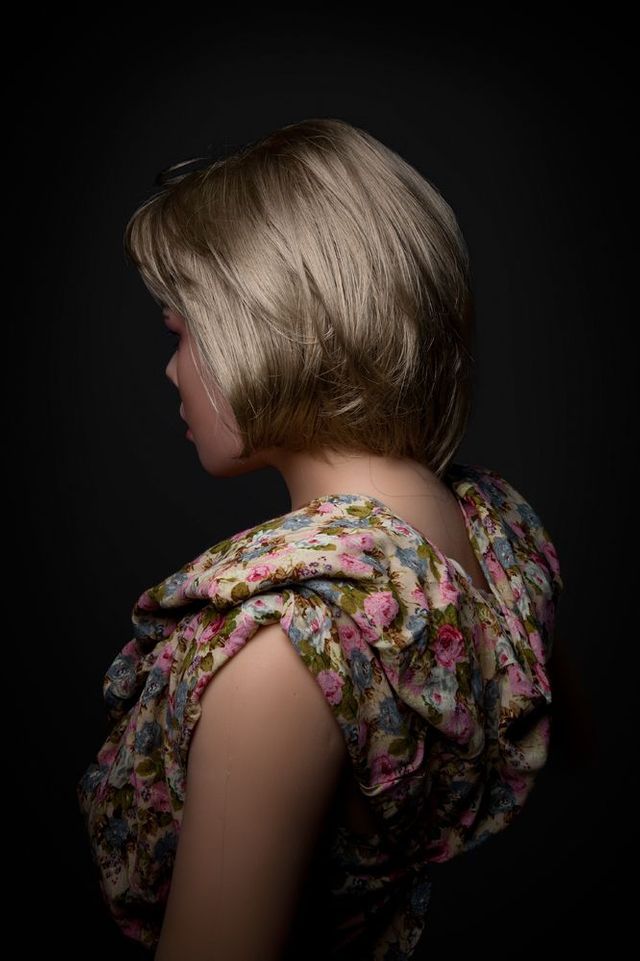 Nur dort habe ich in die Kleidung der Puppen eingegriffen. Die floralen Muster der Kleider verweisen auf die Puppen: Sie sind auch nur ein Abdruck von etwas, das organisch gewachsen ist. Die Puppen sind eine Illusion des Menschen, sie wachsen nicht heran. Schnell vergisst man: Die Puppen haben keine Geschichte, keine Gefühle. Das Baby wird nie erwachsen und die Frau war nie ein Kind. Sie kommen aus dem Nichts, deshalb der schwarze Hintergrund, vor dem sie, abgewandt vom Betrachter, sitzen.