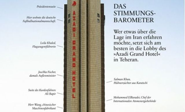 Wenn es in Teheran derzeit einen internationalen Treffpunkt gibt, an dem unverhoffte Begegnungen wie diese möglich sind, dann ist es das »Azadi Grand Hotel«, eines der besten Hotels im Iran. Fünf Sterne und alles, was zu einem Haus der Weltklasse gehört: Swimmingpool (Öffnungszeiten nach Geschlechtern getrennt), Health Club, zwei Restaurants, eine Cafeteria und das Café in der Lobby. Es gibt sogar eine eigene Bank in dem 26-stöckigen Gebäude sowie eine kleine Einkaufspassage. Mit seiner kastenförmigen Struktur, der schmucklosen braunen Fassade und der nüchternen Siebziger-Jahre-Architektur könnte das Gebäude auch das Stadtzentrum einer durchschnittlichen amerikanischen Großstadt bestimmen.