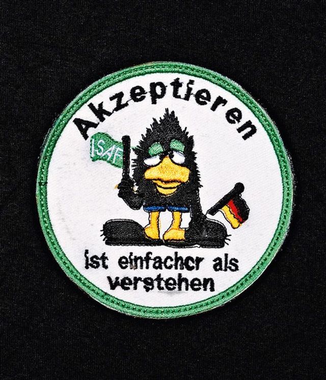 Bei der Bundeswehr dagegen dominieren andere Motivstränge. Einer davon setzt sich mit der Frage auseinander: Was tun wir hier eigentlich noch, wenn sich alle nur noch dafür interessieren, dass wir so bald wie möglich verschwinden? »Akzeptieren ist einfacher als verstehen« etwa ist von einer philosophischen Tiefe, die konkreteren Zielen abgeht: »Good bye, Absurdistan …« Zumindest in Friedenskreisen wird man die Aufnäher gern zur Kenntnis nehmen: Sie deuten nicht gerade auf eine Militarisierung der deutschen Außenpolitik hin.