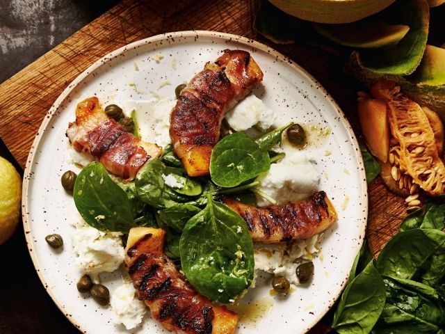 Schmeckt nach Sommer: Die Röstaromen lassen die Melone wunderbar mit salzigem Speck, knackigem Spinatsalat und cremigem Käse harmonieren.