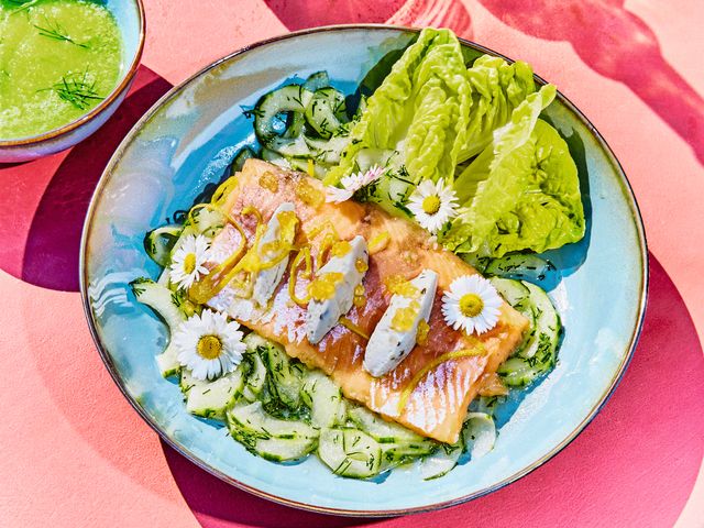 Auf einem Bett aus Gurken und garniert mit Kräuterquark und Kaviar sieht der Fisch nicht nur besonders gut aus, sondern schmeckt auch so.