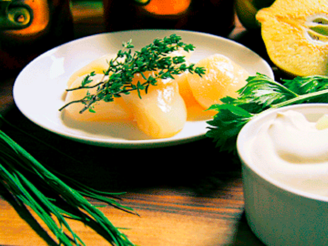 Jakobsmuscheln mit Maronipüree, Quitten und Selleriecreme