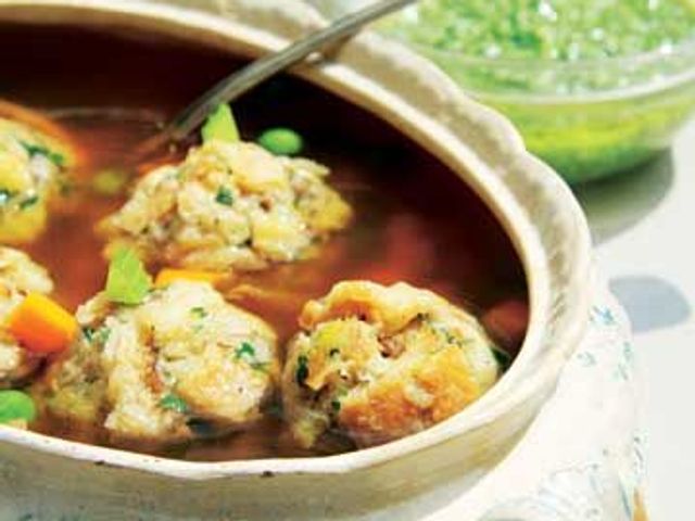 Ein Käse-Mandel-Pesto setzt die Knödel wunderbar in Szene. Die Suppe ist auch für große Gesellschaften geeignet - der Topf kann gar nicht groß genug sein.