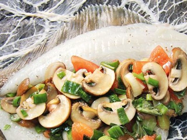 Wer beim Fisch die etwas günstigere Scholle wählt, kann dafür mehr Geld für den Wein ausgeben, findet unser Koch. Er serviert den Fisch im Ganzen, gebraten und gefüllt mit Champignons und Frühlauch.