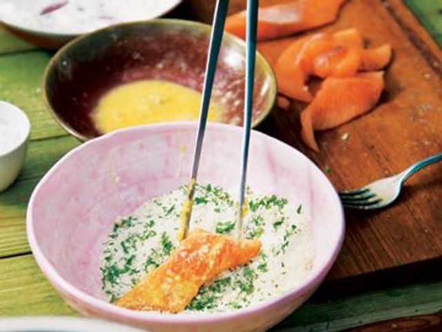 Gebackene Forellenstreifen mit Erbsen und Minze
