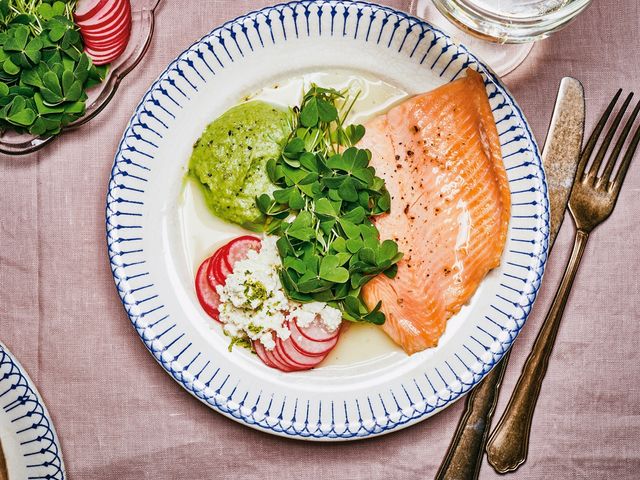 Eine Sellerie-Apfel-Creme, Molke und Stangensellerie machen diese Lachsforelle zu einem leichten und bekömmlichen Essen. Den besonderen Frischekick liefert eine Zutat aus dem Wald.