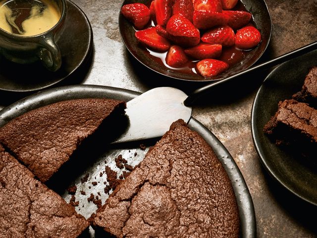 Für alle, die eine Unverträglichkeit haben oder einfach nur Schokolade lieben: Dieser Kuchen schmeckt so gut wie ein echter Brownie. Wenn Sie ihn lauwarm und mit marinierten Erdbeeren servieren, vielleicht sogar besser.