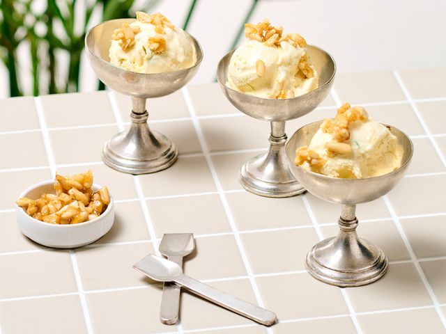 Glücklich, wer mit einem Koch verheiratet ist. Als sich Hans Gerlachs Frau kürzlich ein Eis »mit elegant eingebundener Rosmarinnote« wünschte, kredenzte ihr Mann dieses hier – und garnierte es mit karamellisierten Pinienkernen. Zum Verlieben!