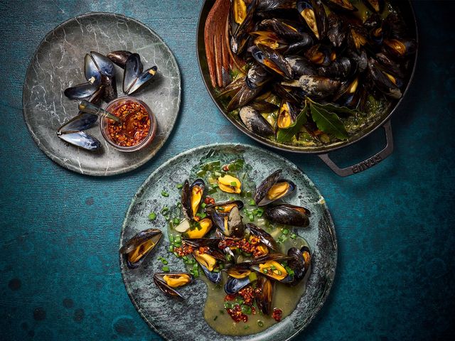 Aufregender als Weißwein oder Tomatensauce: Hans Gerlach gart seine Miesmuscheln in einer Brühe mit viel Knoblauch, Ingwer und Chili-Crunch – und verrät, wie man sie am Ende möglichst elegant aus der Schale löst.