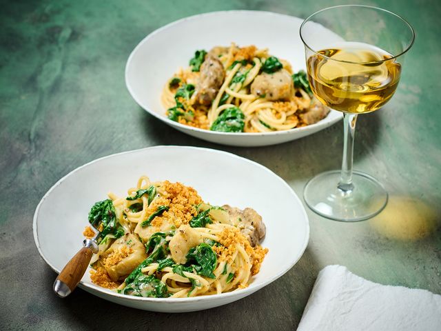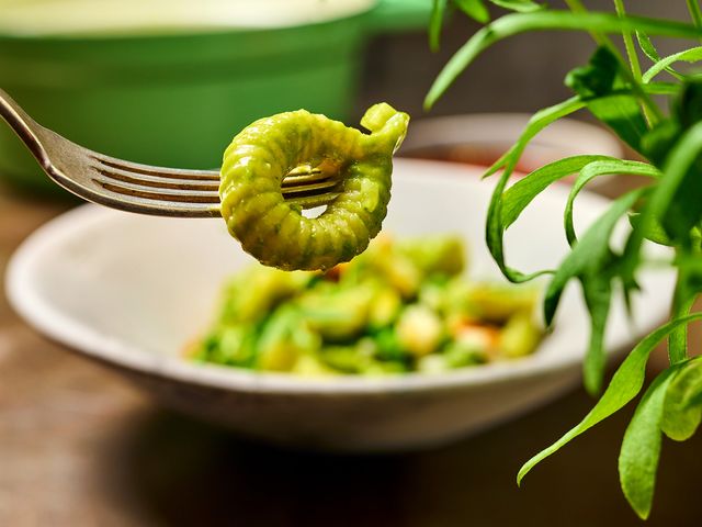 Spitzenpesto für die Ringe-Pasta: Die sardische Nudelsorte Spizzulus lässt sich unkompliziert selbst machen und geht mit einem Estragon-Erbsen-Pesto eine himmlische Verbindung ein. Wer braucht da noch Parmesan?