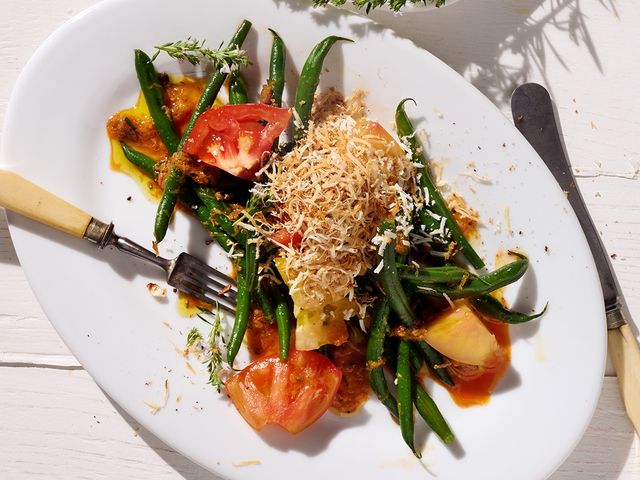 Über seinen Bohnensalat mit bunten Tomaten reibt Hans Gerlach keinen gewöhnlichen Parmesan, sondern Ricotta infornata – im Ofen gebackenen Frischkäse. Eine besondere Geschmacksnote verleiht ein Kraut, das in seinem Garten wuchert.