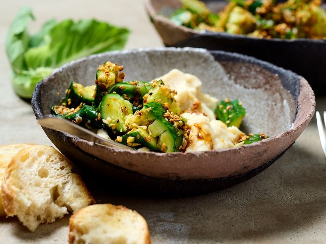 Was passiert, wenn man eine Gurke quetscht, in grobe Stücke schneidet, japanisch würzt und auf ein cremiges Püree von Fava-Bohnen legt? Dann hat man ein leichtes, erfrischendes und sättigendes Essen.