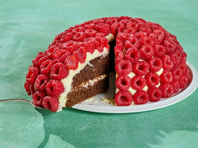 Zugegeben: Es ist viel Arbeit, 140 sehr schöne Himbeeren auszusuchen und dann ganz regelmäßig zu arrangieren. Doch dieser Kuchen macht nicht nur Mühe – sondern auch richtig viel her.