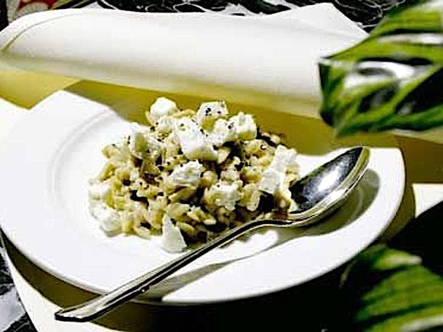 Einfach, vegetarisch, köstlich: dieses griechische Nudelrisotto mit Aubergine und Schafskäse, abgelöscht mit Weißwein und beträufelt mit Olivenöl.