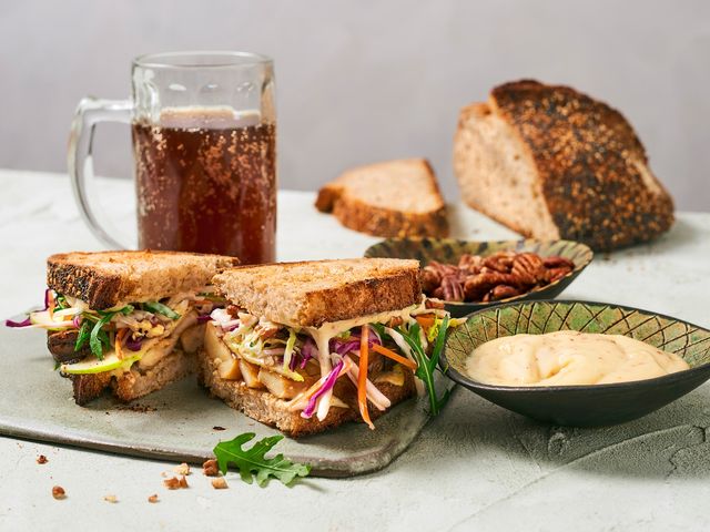 Das knackige Sandwich ist dank Kraut, Nüssen und glasierten Pilzen bunt, frisch und herzhaft-sättigend. Mit pflanzlicher Mayonnaise wird es zudem vegan.