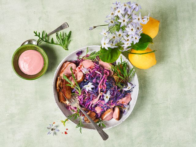 Die Bäume blühen, aber bis das neue Gemüse geerntet werden kann, dauert es noch. Für die Übergangszeit ist dieser Salat perfekt: mit mehr Rotkohl ist er winterlicher, mit mehr Kohlrabi frühlingshafter. Man kann ihn kalt oder warm genießen – und er schmückt jedes Picknick.