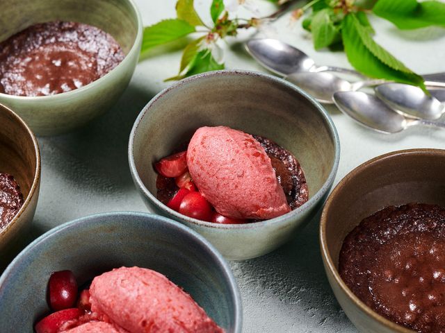 Dieser Schoko-Tassenkuchen ist halbflüssig und vegan. Mit Salzkaramell und Kirschsorbet wird er zum perfekten Sommerdessert.
