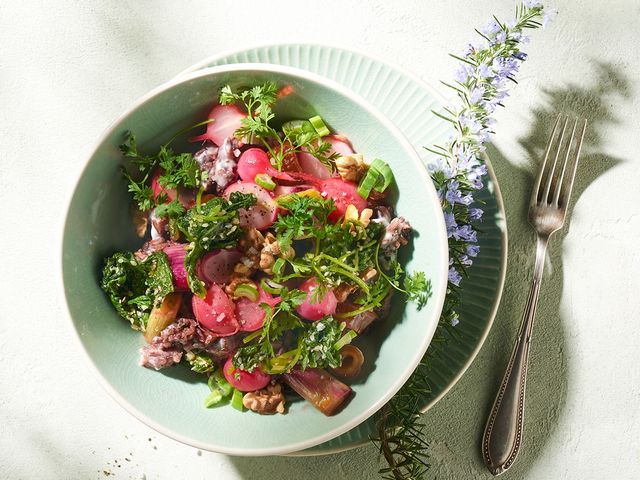 Lauwarmer Radieschensalat mit Vollkornreis, Datteln und Walnüssen