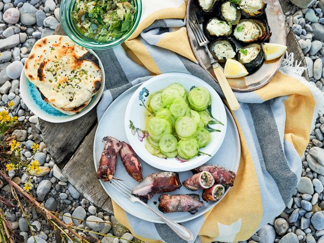 Gegrillte Tintenfische mit Kartoffel-Feta-Füllung und Gurkensalat