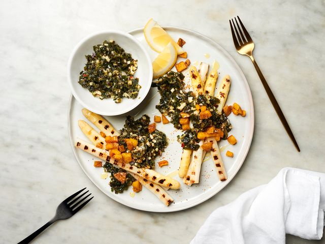 Weißbrot, Spargel, Ommm: Statt an gar nichts zu denken, kreiert unser Kochkolumnist auf der Yogamatte neue Brotsalate – so wie diesen mit Spargel und Zitronensauce. Das schadet zwar seiner Entspannung, nützt aber unserem Genuss.