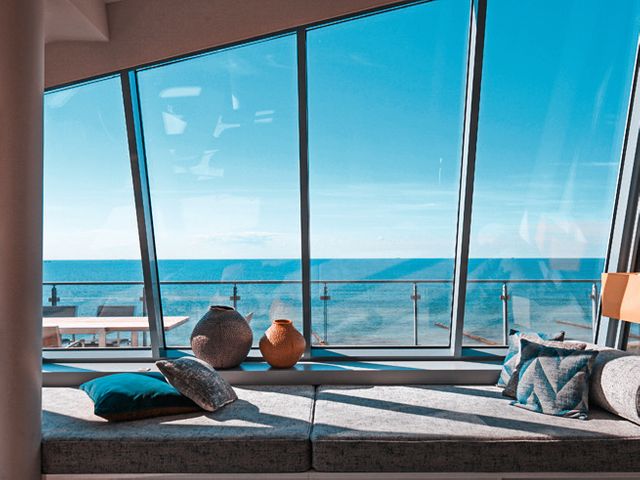 Vom Hotel »The Grand« in Ahrenshoop blickt man auf 14 Kilometer feinste, weiße Sandkörner. Hier kann man sogar seine Hunde ausführen lassen – vom Gassi-Service.