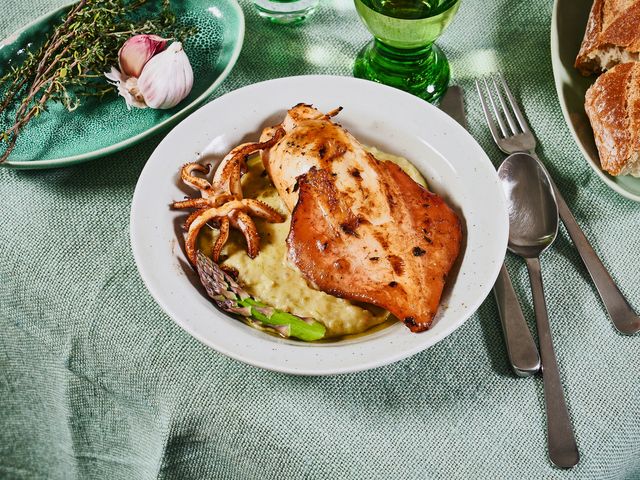 Spargel mal anders, mal ganz anders? Dann probieren Sie dieses Rezept für gefüllte Calamari auf einer Creme aus grünem Spargel.