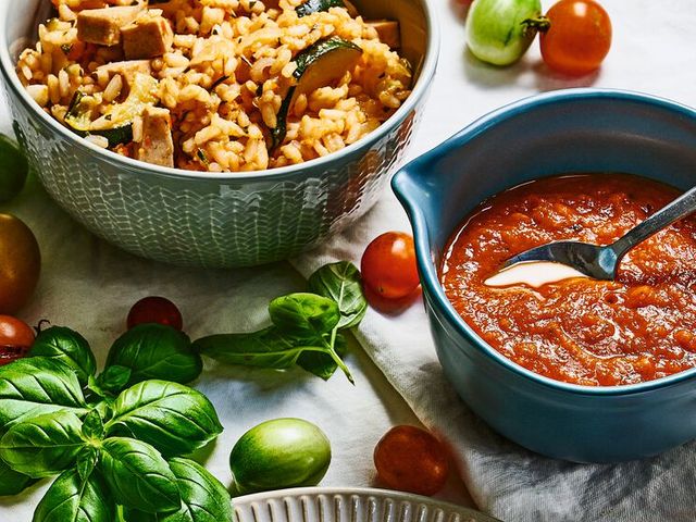Risotto mit Zucchini, Kopfsalat und Tomatencreme