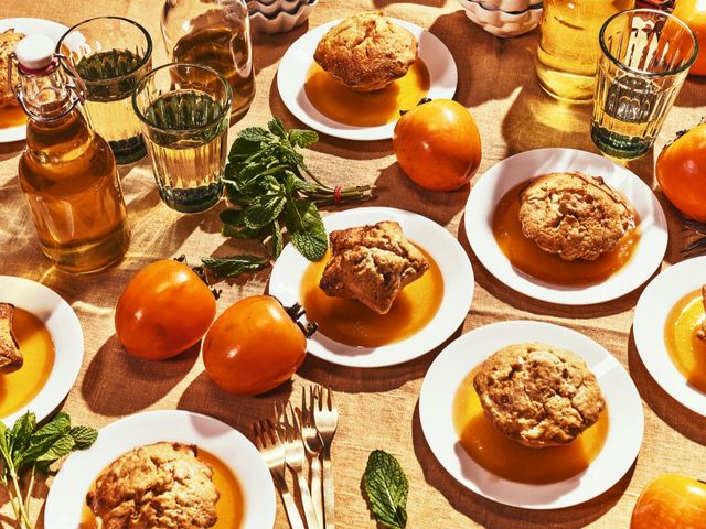 Bei diesen Vanille-Apfel-Küchlein mit Portweinsauce übertrumpft die Neben- die Hauptrolle: Erst durch die Kaki, püriert zu einer feinen Creme, wird dieses Dessert zu etwas ganz Besonderem.