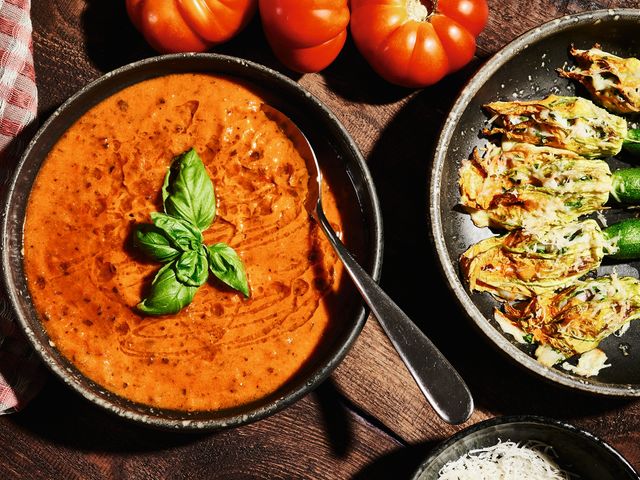 Tomatencremesuppe mit gefüllten Zucchiniblüten