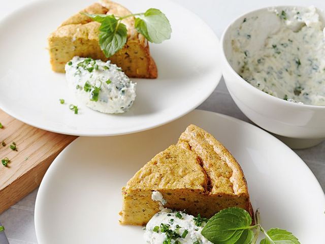 Diese herzhafte, mit einer Ricotta-Schnittlauch-Creme angerichtete Karottentorte vereint das Beste einer Vor-, Haupt- und Nachspeise auf einem Teller.