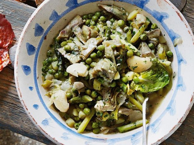 Vignarola: Erbsen-Artischocken-Spargelsalat mit gerösteter Schweinebacke