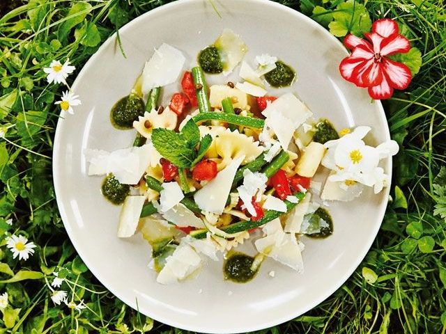 Ob dieser Sommersalat mit Farfalline und lauwarmem Gemüse gelingt, hängt vom Pesto ab – eine Wissenschaft für sich. Aber Sie machen das schon.