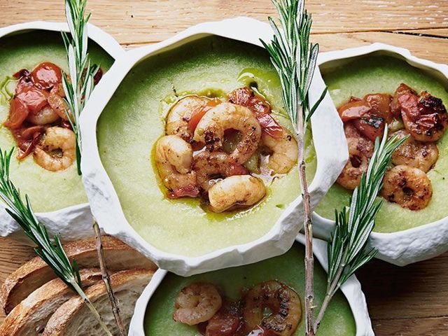 Der grüne Romanesco-Blumenkohl in einer Variante zum Löffeln: als cremiges Püree mit Parmesan, Garnelen, Tomatenwürfeln und geröstetem Brot.