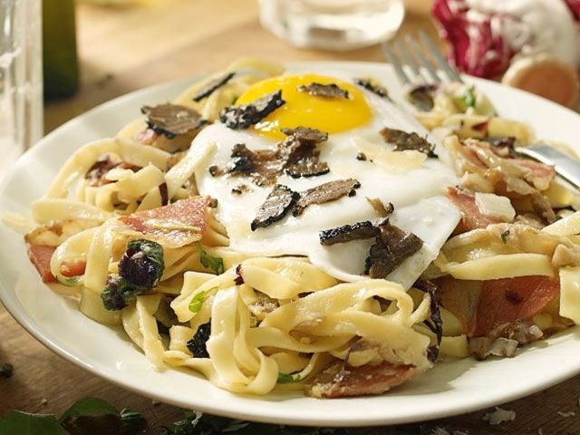 Nudeln mit Trüffel-Spiegelei, Radicchio und Speck