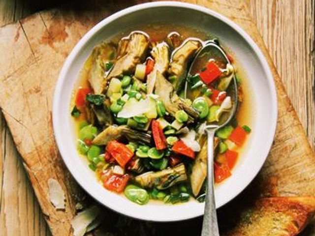 Frühjahrs-Gemüsesuppe mit jungen Bohnen und Artischocken