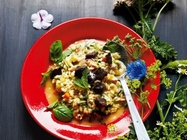 Dieses Risotto hat eine lange Tradition. Das Gericht aus vielen Gemüsesorten, Reis und Rind war schon das Hochzeitsmahl ihrer Eltern. Heute bereitet es unsere Köchin in einer etwas leichteren Variante zu.
