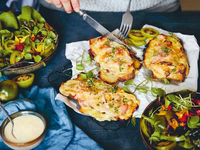 Freitags feiert die Familie unserer Köchin »Schlotzfest«, bei dem alle gemeinsam kochen, schlemmen, einen Film gucken und vor allem auf dem Sofa die Woche Revue passieren lassen. Die Hauptzutat sind diese überbackenen französischen Schinken-Käsebrote, an denen seitlich der Käse hinunterläuft.