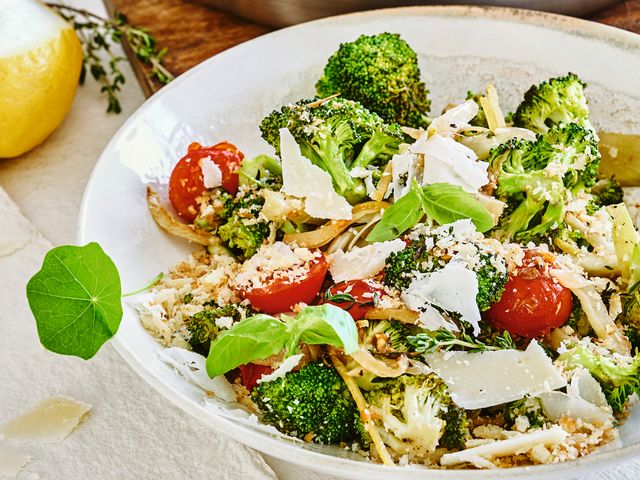 Warmer Brokkoli-Salat mit Miso, Kirschtomaten und Parmesan