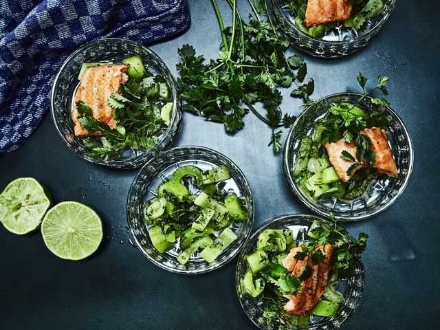 Die gegrillte Lachsforelle serviert unser Koch mit blanchierten Gurken. Für die Marinade kombiniert er zwei Grundzutaten der bayerischen und japanischen Küche: Senf und Miso.