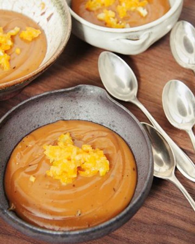 Den Muscovado-Zucker in einen Topf geben, erhitzen und die Butter dazugeben, 5 Minuten rühren. Mit der Sahne ablöschen und aufkochen, Pfeffer zugeben. Mit Stärke abbinden, bis die Flüssigkeit eine breiige Konsistenz bekommt. In vier Schüsseln abfüllen und abkühlen lassen, bis die Masse Raumtemperatur erreicht hat. Mit den gehackten Kumquats bestreuen und servieren.