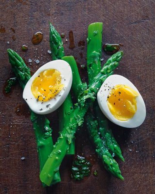 Die holzigen Teile des Wildspargels abschneiden. Die zarten Spitzen - sie sind 15 bis 17 cm lang - zusammen mit dem grünen Knoblauch (oder einer halbierten Knoblauchzehe) in leicht gesalzenem Wasser etwa 5 Minuten kochen. Sie sollten am Ende noch al dente sein. Eier im Spargelsud fünf bis sechs Minuten kochen, vor dem Schälen in kaltem Wasser abschrecken. Über den gekochten Spargel Olivenöl, Salz und Pfeffer sowie gehäckselte Petersilie geben. Die Hälfte des gewürzten Spargels in die Mitte einer Servierplatte legen, darauf die geschälten und halbierten Eier, darüber die übrigen Spargelspitzen verteilen. Essen Sie das Gericht heiß, dann genießen Sie das volle Aroma des Eis und den leicht bitteren Geschmack des Spargels am intensivsten.