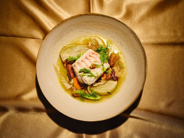 Den Fisch in 4 Portionen aufteilen. Gemüse schälen und abwiegen. Fenchel in 16 Spalten schneiden, Möhren, Zwiebeln und Ingwer in dünnere Scheiben. Das Backpapier auf 4 tiefe Teller legen. Darauf jeweils schichtweise mittig setzen: Fenchel, Möhren, Zwiebeln, Ingwer, zerbrochene Zimtstangen, Walnüsse, Datteln, Sternanise, Honig, Hälfte der Rosmarinnadeln. Mit 2 EL Olivenöl beträufeln, mit Orangensaft angießen und salzen.