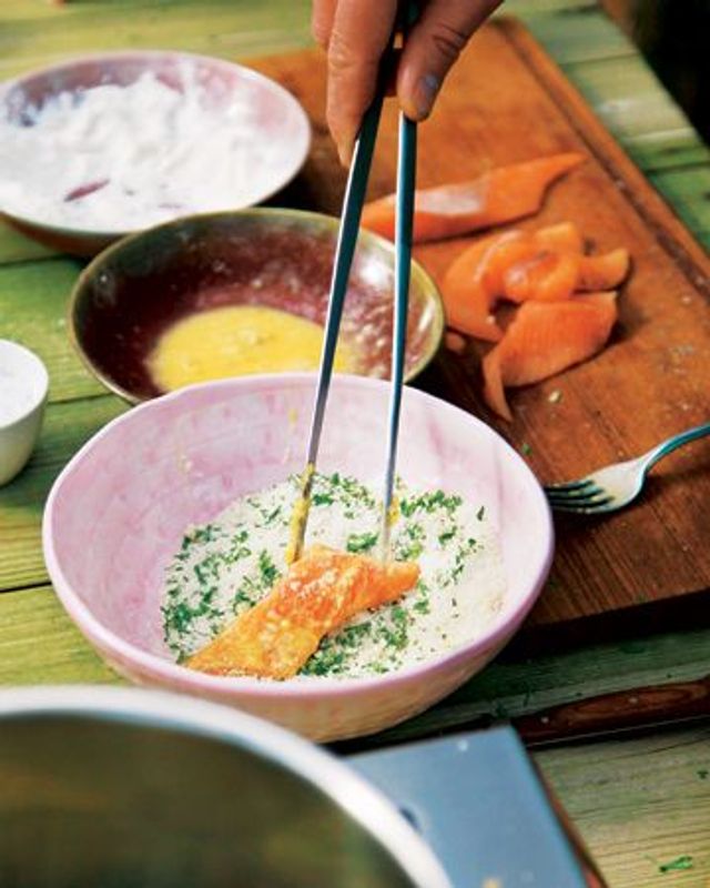Gebackene Forellenstreifen mit jungen Erbsen und Minze (4 Personen)