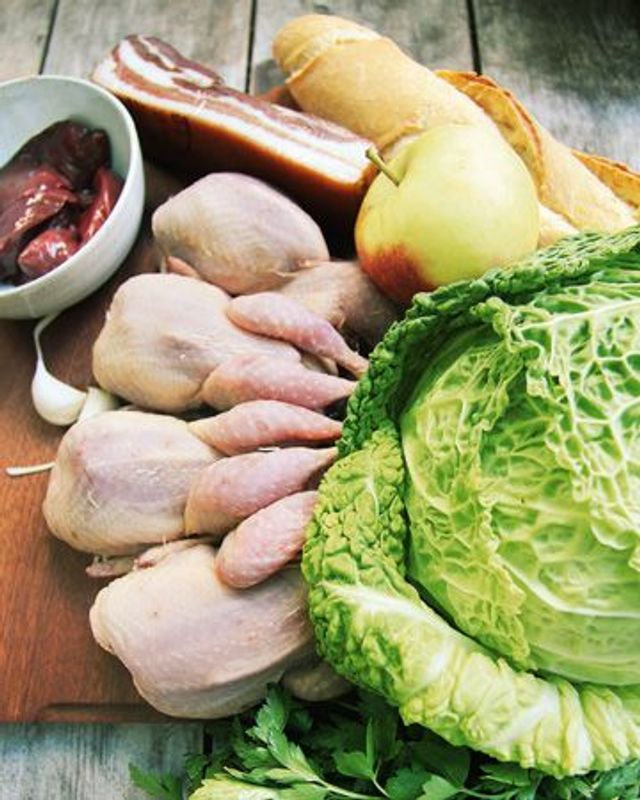 Wachteln ausnehmen, abflämmen, auslösen, salzen. Weißbrot, Leber und Apfel je klein würfeln. Hälfte der Brotwürfel in einem TL Butter anrösten, getrennt restliche Butter mit Leber und Apfel ansautieren. Alle Zutaten mischen, mit Gewürzen abschmecken. Wachteln mit der Farce füllen. Wirsing vom Strunk befreien, Blätter einzeln waschen, in Salzwasser blanchieren. Wasser abschütten, Blätter in Eiswasser tauchen, gut abtropfen lassen. Klein gewürfelten Speck, Zwiebel, Knoblauch kurz anschwitzen. Wirsing zugeben, würzen, 20 Min. zugedeckt weich dünsten. Alles im Mixer pürieren, nochmals kurz erhitzen, Sahne unterziehen, Petersilie zugeben. Öl in einer Pfanne erhitzen, Wachteln hineingeben, im vorgeheizten Backofen etwa 14 Min. bei 250 Grad braten. Herausnehmen, mit Wirsing auf vorgewärmten Tellern servieren.
