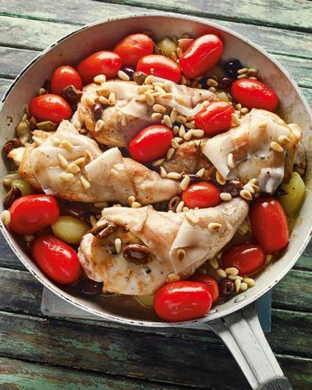 Kartoffeln schälen, halbieren, in Salzwasser halb gar kochen und in einem Sieb abtropfen lassen. Schalotten schälen und vierteln, Knoblauchzehen schälen und mit dem Messer zerdrücken, Tomaten waschen. Kaninchenkeulen mit Salz und Pfeffer würzen und von beiden Seiten in Olivenöl goldgelb anbraten. Oliven mit Kartoffeln, Schalotten, Knoblauch, Rosmarin und Thymian in eine Bratreine geben. Obenauf die Kaninchenkeulen legen, mit Weißwein und Geflügelbrühe übergießen und zirka 30 Minuten im vorgeheizten Ofen (etwa 180 °) schmoren lassen. Etwa 10 Minuten vor Garzeitende Kirschtomaten zugeben und auf jede Kaninchenkeule 2 Scheiben Lardo legen. Pinienkerne in einer Pfanne ohne Fett goldbraun rösten. Das fertige Schmorgericht aus dem Ofen nehmen, mit den Pinienkernen bestreuen und etwas Zitronenzeste darüberreiben.