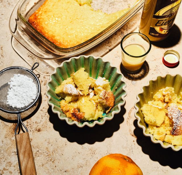 Mit dem Handrührgerät 1 Ei und 3 Eigelb nach und nach unter die abkühlte Grießmasse rühren, dann den Abrieb der Orange, den Eierlikör und das Vanillepuddingpulver hinzufügen. Die 3 Eiweiß mit einer Prise Salz und dem restlichen Zucker zu einem halbsteifen Eischnee aufschlagen. Den Eischnee vorsichtig unter die Masse heben und das Ganze in die vorbereitete Auflaufform füllen. Den Grießauflauf im vorgeheizten Backofen ungefähr 20 Minuten backen und mit Früchten der Saison angerichtet servieren.