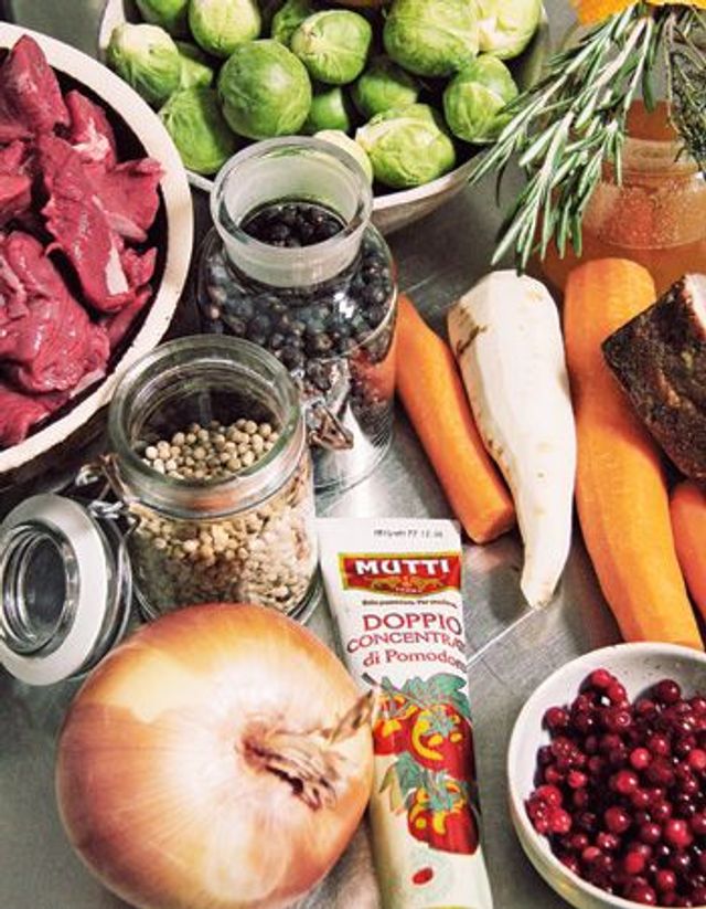 Fleisch salzen und pfeffern. Portionsweise im Schmortopf mit Öl braun anbraten, dann Speck mitrösten, Karotten, Sellerie und Petersilienwurzel zugeben, bis diese braun sind, dann Zwiebeln braun rösten. Honig und Tomatenmark zugeben, kurz mitschwitzen. Mit etwas Rotwein ablöschen und einkochen lassen – dreimal wiederholen. Preiselbeeren, Wacholder, Pfefferkörner kurz mit anschwitzen. Mit Wasser auffüllen, bis das Fleisch bedeckt ist. Orangenschale, Apfel und restliche Gewürze zugeben, 1,5 bis 2 Stunden im geschlossenen Topf schmoren lassen. Hirschwürfel herausnehmen, Sauce passieren. Eventuell mit etwas Stärke abziehen. Mit Gin, Essig und Crème fraîche abschmecken, kalte Butterwürfel unterrühren. Mit Semmelknödeln oder Spätzle anrichten, dazu Maroni, Rosenkohl und Preiselbeeren reichen.
