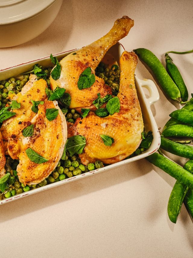 »Ich freue mich in jedem Jahr auf die ersten frischen Erbsen. Die Kombination mit Huhn ist besonders köstlich. Es empfiehlt sich, ein ganzes Huhn zu kaufen, dann kann man nebenbei noch einen Geflügelfond ansetzen.«