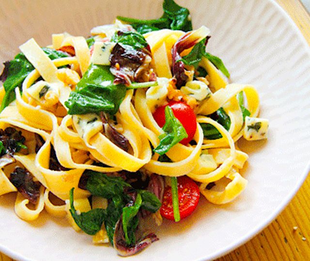 Für die Sauce Hälfte der Butter zerlaufen lassen, 1 EL Puderzucker einstreuen. Radicchio in Stücke rupfen, hinzugeben, kurz schmoren. Gemüsebrühe aufgießen und einreduzieren. Mit restlicher Butter die Sauce binden. Mit Nudelmaschine Tagliatelle herstellen. In Salzwasser al dente kochen, abschütten und zur Radicchiosauce geben. Nüsse, Spinat und Kirschtomaten hinzufügen, durchschwenken. Mit Salz, Muskat, Pfeffer abschmecken. Kurz vor dem Servieren den in feine Würfel geschnittenen Fourme d’Ambert untermischen. Mit ein wenig Oliven- oder Limonenöl abschmecken.